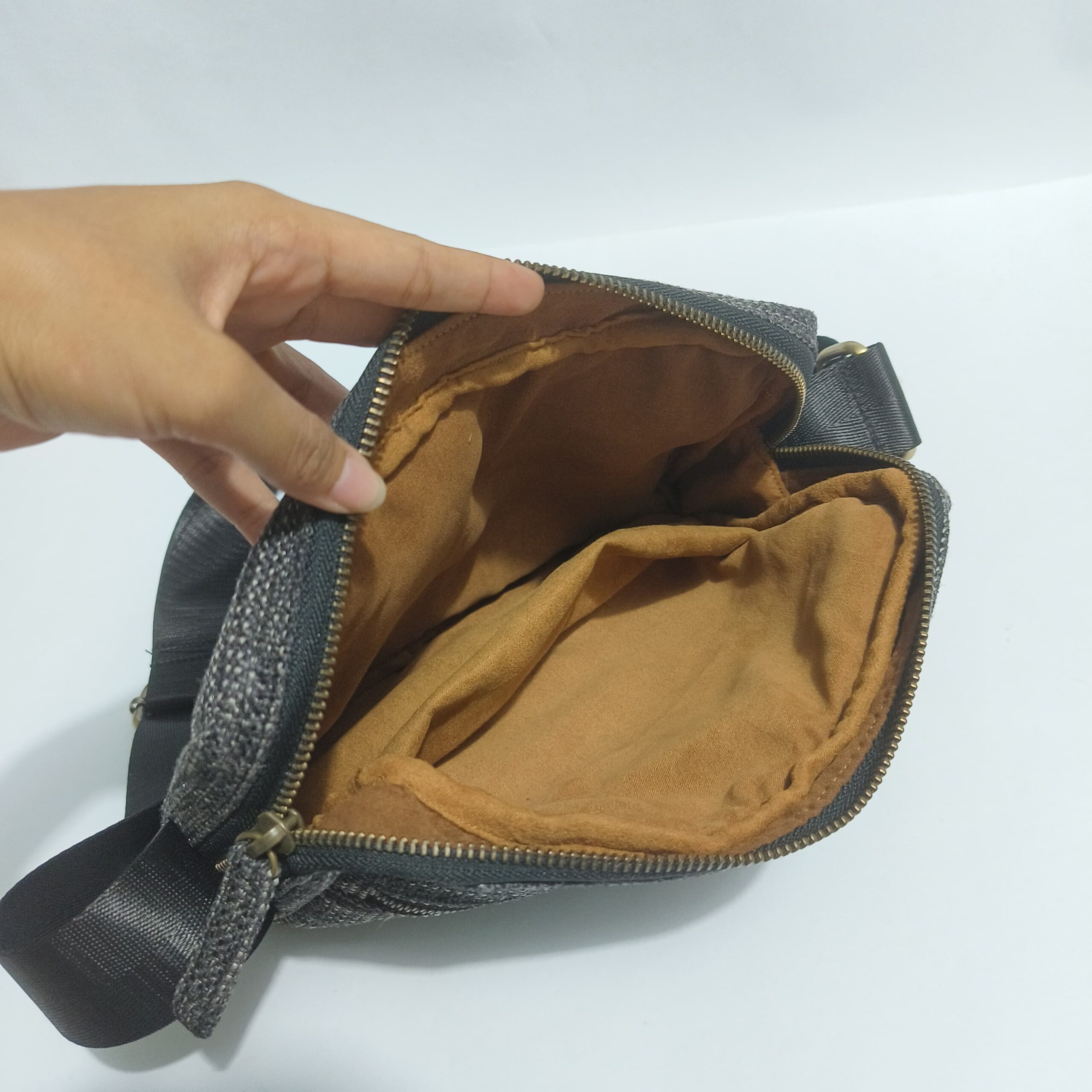 Space: Tas Selempang Pria ini memiliki 3 space ruang. Space ruang utama cukup luas, muat untuk menyimpan buku kecil, kacamata, charger, dompet, dan lainnya. Dilengkapi dengan kantong tempel didalam. Terdapat juga 2 space ruang lagi yaitu 1 dibagian depan dan 1 lagi dibelakang. Menggunakan tali panjang berukuran 125 cm yang dapat disesuaikan panjang pendeknya. Bahan tali: webbing nylon.