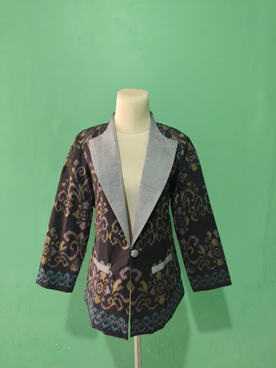 Blazer tenun endek dengan variasi leher berkerah. Menggkunakan 1 kancing .untuk dibagian bawah terdapat dua kantong.